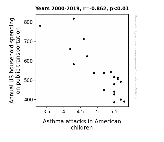 This means 74.3% of the change in the one variable (i.e., Asthma attacks in American children) is predictable based on the change in the other (i.e., Annual US household spending on public transportation) over the 20 years from 2000 through 2019.