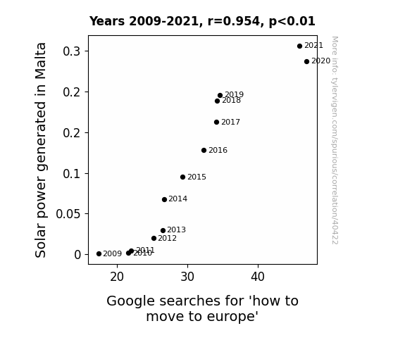 This means 91% of the change in the one variable (i.e., Google searches for 'how to move to europe') is predictable based on the change in the other (i.e., Solar power generated in Malta) over the 13 years from 2009 through 2021.