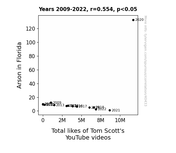 This means 30.7% of the change in the one variable (i.e., Total likes of Tom Scott's YouTube videos) is predictable based on the change in the other (i.e., Arson in Florida) over the 14 years from 2009 through 2022.