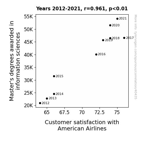 As the number of Master's degrees awarded in information sciences rose, so did the knowledge of how to ensure smooth flight operations. These tech-savvy individuals probably revolutionized American Airlines' booking systems, in-flight entertainment, and overall customer experience. Who knew that the secret to happier flyers was hidden in lines of code and data analysis!Discover a new correlation