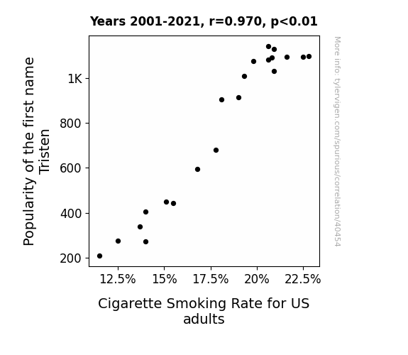 This means 94.2% of the change in the one variable (i.e., Cigarette Smoking Rate for US adults) is predictable based on the change in the other (i.e., Popularity of the first name Tristen) over the 21 years from 2001 through 2021.