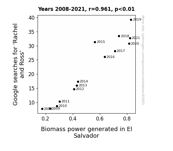 This means 92.3% of the change in the one variable (i.e., Biomass power generated in El Salvador) is predictable based on the change in the other (i.e., Google searches for 'Rachel and Ross') over the 14 years from 2008 through 2021.