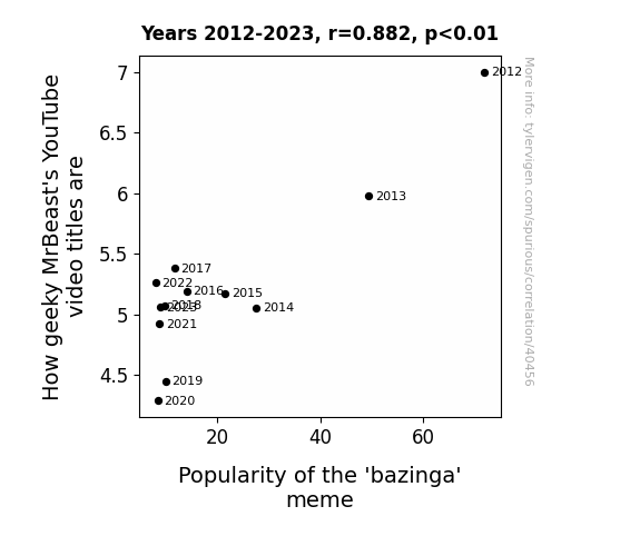 This means 77.8% of the change in the one variable (i.e., Popularity of the 'bazinga' meme) is predictable based on the change in the other (i.e., How geeky MrBeast's YouTube video titles are) over the 12 years from 2012 through 2023.