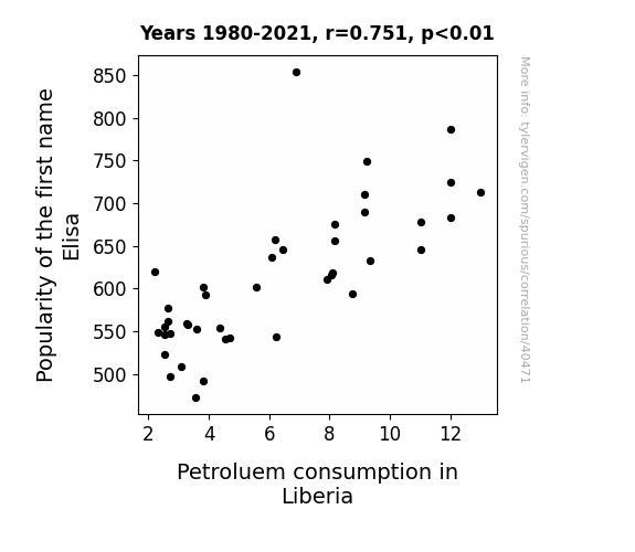 This means 56.4% of the change in the one variable (i.e., Petroluem consumption in Liberia) is predictable based on the change in the other (i.e., Popularity of the first name Elisa) over the 42 years from 1980 through 2021.