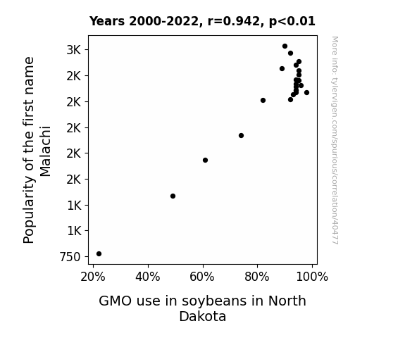 This means 88.8% of the change in the one variable (i.e., GMO use in soybeans in North Dakota) is predictable based on the change in the other (i.e., Popularity of the first name Malachi) over the 23 years from 2000 through 2022.