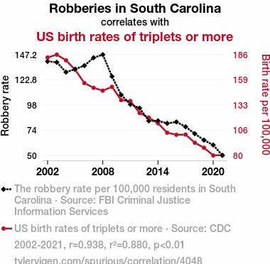 - The spurious research paper: The Great Caper: Investigating the Link between Robberies in South Carolina and the Birth Rate of Triplets or More in the United States