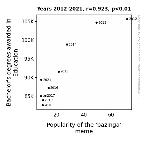 This means 85.2% of the change in the one variable (i.e., Popularity of the 'bazinga' meme) is predictable based on the change in the other (i.e., Bachelor's degrees awarded in Education) over the 10 years from 2012 through 2021.