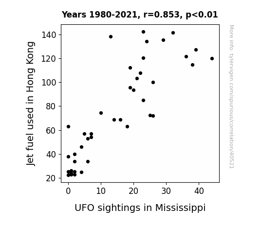 This means 72.7% of the change in the one variable (i.e., UFO sightings in Mississippi) is predictable based on the change in the other (i.e., Jet fuel used in Hong Kong) over the 42 years from 1980 through 2021.