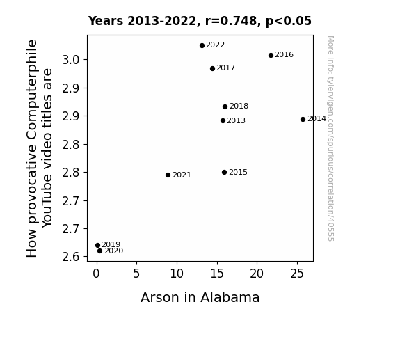 This means 56% of the change in the one variable (i.e., Arson in Alabama) is predictable based on the change in the other (i.e., How provocative Computerphile YouTube video titles are) over the 10 years from 2013 through 2022.