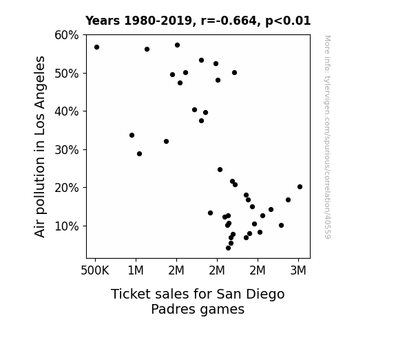 This means 44.1% of the change in the one variable (i.e., Ticket sales for San Diego Padres games) is predictable based on the change in the other (i.e., Air pollution in Los Angeles) over the 40 years from 1980 through 2019.