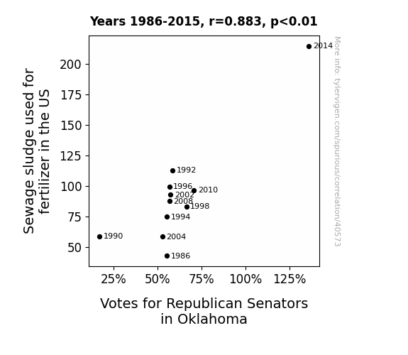 This means 77.9% of the change in the one variable (i.e., Votes for Republican Senators in Oklahoma) is predictable based on the change in the other (i.e., Sewage sludge used for fertilizer in the US) over the 11 years from 1986 through 2015.
