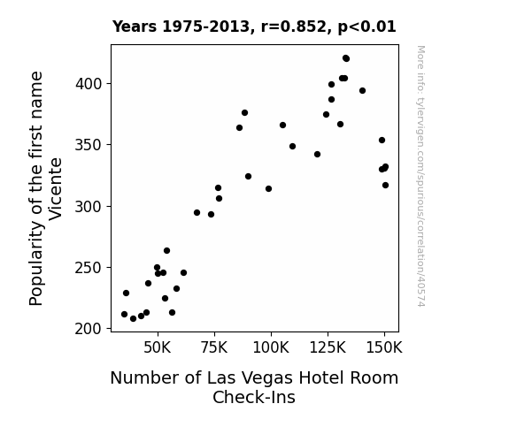 This means 72.6% of the change in the one variable (i.e., Number of Las Vegas Hotel Room Check-Ins) is predictable based on the change in the other (i.e., Popularity of the first name Vicente) over the 39 years from 1975 through 2013.