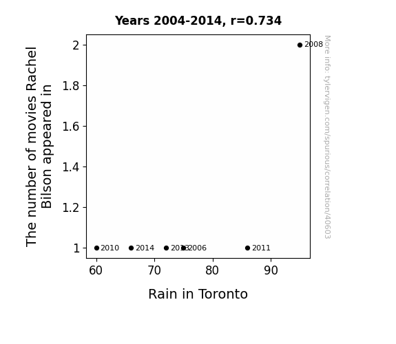 This means 53.8% of the change in the one variable (i.e., Rain in Toronto) is predictable based on the change in the other (i.e., The number of movies Rachel Bilson appeared in) over the 6 years from 2004 through 2014.