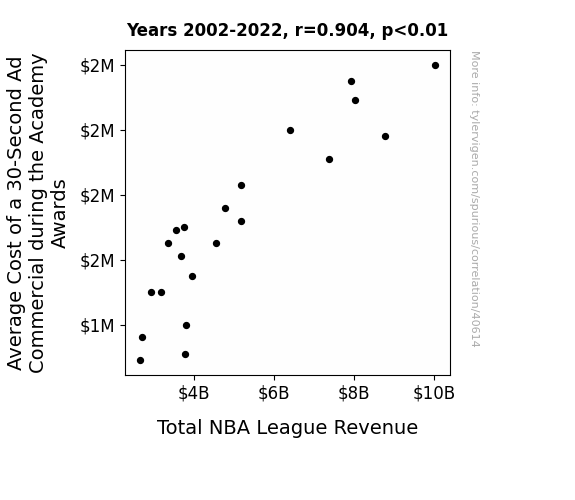 This means 81.7% of the change in the one variable (i.e., Total NBA League Revenue) is predictable based on the change in the other (i.e., Average Cost of a 30-Second Ad Commercial during the Academy Awards) over the 21 years from 2002 through 2022.