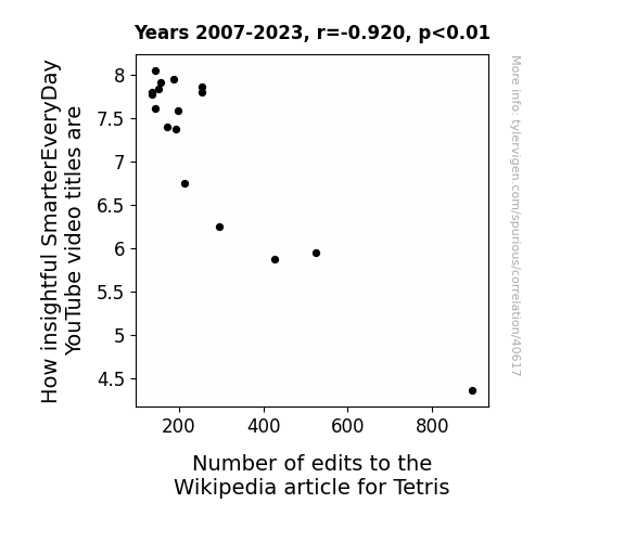 This means 84.6% of the change in the one variable (i.e., Number of edits to the Wikipedia article for Tetris) is predictable based on the change in the other (i.e., How insightful SmarterEveryDay YouTube video titles are) over the 17 years from 2007 through 2023.