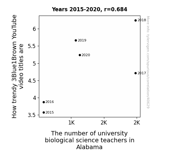 This means 46.8% of the change in the one variable (i.e., The number of university biological science teachers in Alabama) is predictable based on the change in the other (i.e., How trendy 3Blue1Brown YouTube video titles are) over the 6 years from 2015 through 2020.