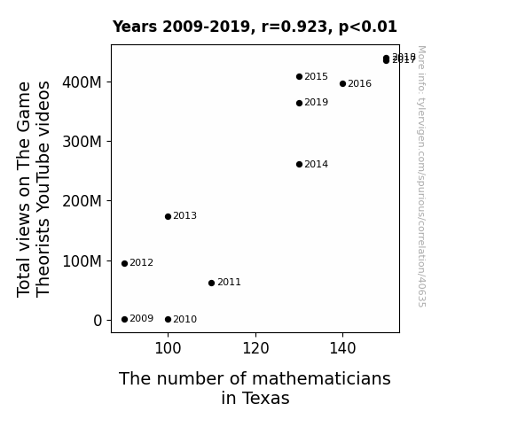 This means 85.1% of the change in the one variable (i.e., The number of mathematicians in Texas) is predictable based on the change in the other (i.e., Total views on The Game Theorists YouTube videos) over the 11 years from 2009 through 2019.