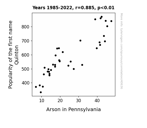 This means 78.4% of the change in the one variable (i.e., Arson in Pennsylvania) is predictable based on the change in the other (i.e., Popularity of the first name Quinton) over the 38 years from 1985 through 2022.