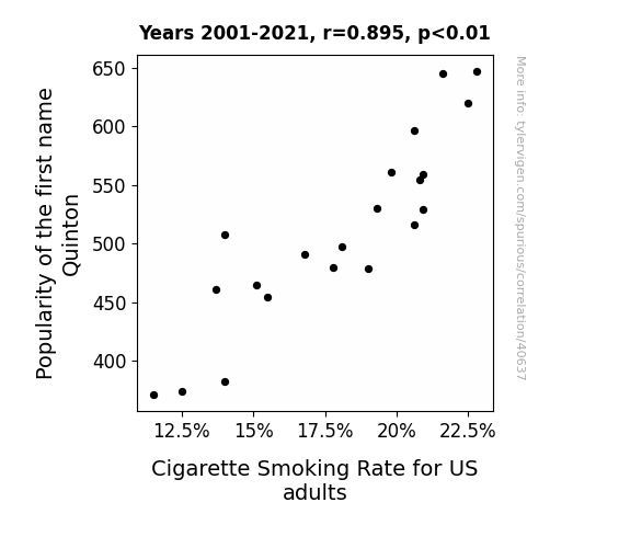 This means 80.2% of the change in the one variable (i.e., Cigarette Smoking Rate for US adults) is predictable based on the change in the other (i.e., Popularity of the first name Quinton) over the 21 years from 2001 through 2021.