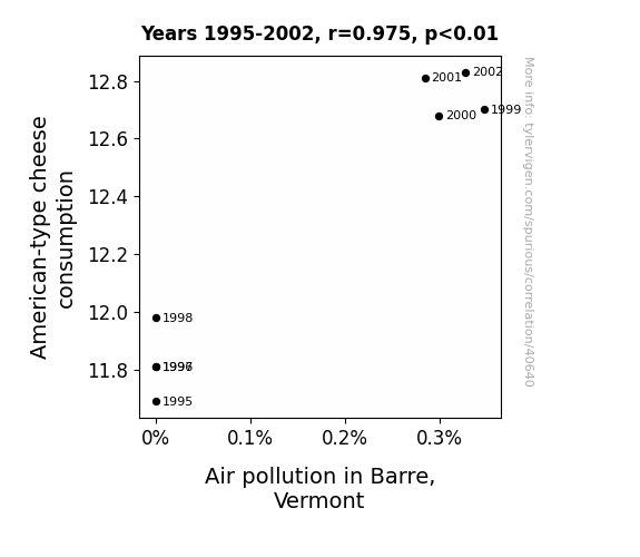 This means 95.1% of the change in the one variable (i.e., Air pollution in Barre, Vermont) is predictable based on the change in the other (i.e., American-type cheese consumption) over the 8 years from 1995 through 2002.