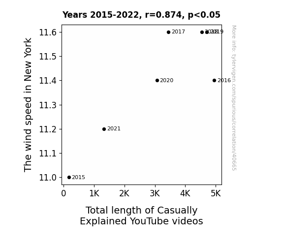 This means 76.4% of the change in the one variable (i.e., Total length of Casually Explained YouTube videos) is predictable based on the change in the other (i.e., The wind speed in New York) over the 7 years from 2015 through 2022.