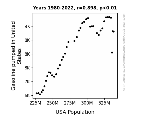 This means 80.6% of the change in the one variable (i.e., USA Population) is predictable based on the change in the other (i.e., Gasoline pumped in United States) over the 43 years from 1980 through 2022.
