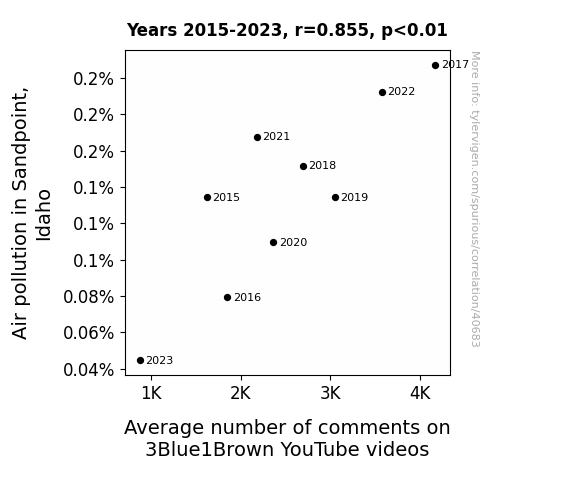 This means 73% of the change in the one variable (i.e., Average number of comments on 3Blue1Brown YouTube videos) is predictable based on the change in the other (i.e., Air pollution in Sandpoint, Idaho) over the 9 years from 2015 through 2023.