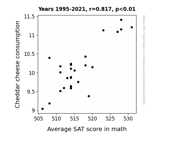 This means 66.7% of the change in the one variable (i.e., Average SAT score in math) is predictable based on the change in the other (i.e., Cheddar cheese consumption) over the 27 years from 1995 through 2021.