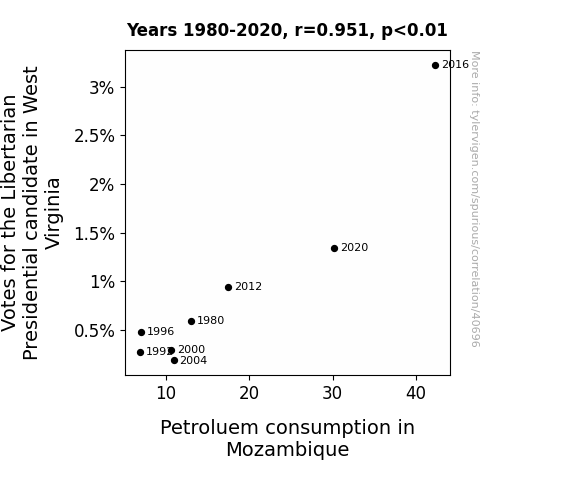 This means 90.4% of the change in the one variable (i.e., Petroluem consumption in Mozambique) is predictable based on the change in the other (i.e., Votes for the Libertarian Presidential candidate in West Virginia) over the 8 years from 1980 through 2020.