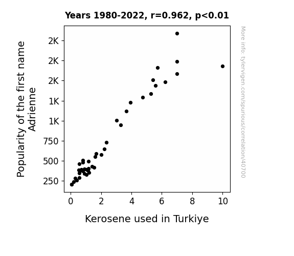 This means 92.6% of the change in the one variable (i.e., Kerosene used in Turkiye) is predictable based on the change in the other (i.e., Popularity of the first name Adrienne) over the 43 years from 1980 through 2022.