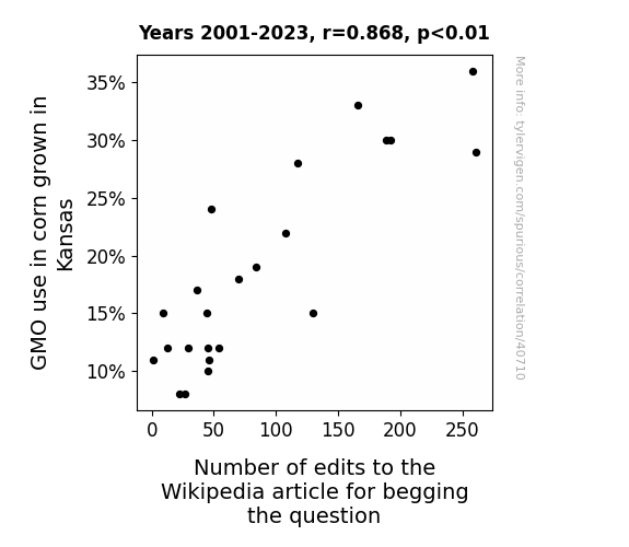 This means 75.3% of the change in the one variable (i.e., Number of edits to the Wikipedia article for begging the question) is predictable based on the change in the other (i.e., GMO use in corn grown in Kansas) over the 23 years from 2001 through 2023.