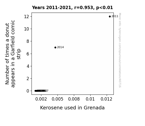 This means 90.8% of the change in the one variable (i.e., Kerosene used in Grenada) is predictable based on the change in the other (i.e., Number of times a donut appears in a Garfield comic strip) over the 11 years from 2011 through 2021.