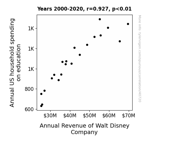 This means 85.9% of the change in the one variable (i.e., Annual Revenue of Walt Disney Company) is predictable based on the change in the other (i.e., Annual US household spending on education) over the 21 years from 2000 through 2020.