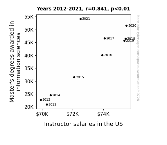 This means 70.7% of the change in the one variable (i.e., Instructor salaries in the US) is predictable based on the change in the other (i.e., Master's degrees awarded in information sciences) over the 10 years from 2012 through 2021.
