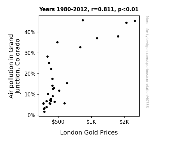 This means 65.8% of the change in the one variable (i.e., London Gold Prices) is predictable based on the change in the other (i.e., Air pollution in Grand Junction, Colorado) over the 33 years from 1980 through 2012.