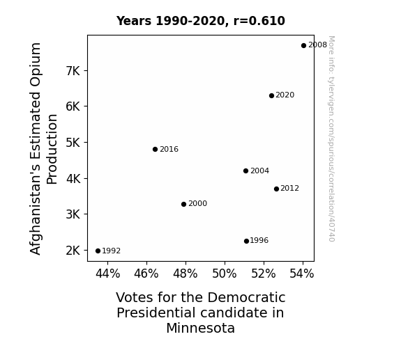 This means 37.2% of the change in the one variable (i.e., Votes for the Democratic Presidential candidate in Minnesota) is predictable based on the change in the other (i.e., Afghanistan's Estimated Opium Production) over the 8 years from 1990 through 2020.