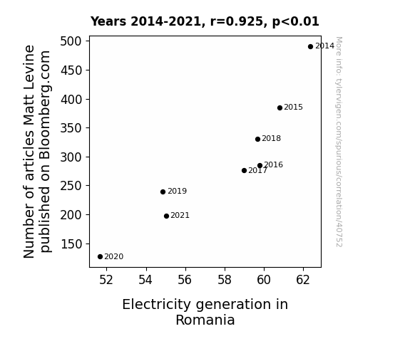 This means 85.6% of the change in the one variable (i.e., Electricity generation in Romania) is predictable based on the change in the other (i.e., Number of articles Matt Levine published on Bloomberg.com) over the 8 years from 2014 through 2021.