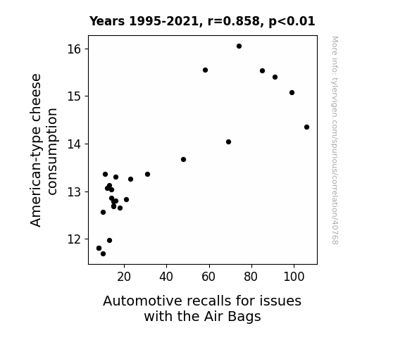 This means 73.6% of the change in the one variable (i.e., Automotive recalls for issues with the Air Bags) is predictable based on the change in the other (i.e., American-type cheese consumption) over the 27 years from 1995 through 2021.