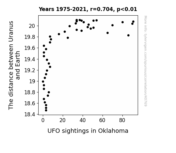 This means 49.6% of the change in the one variable (i.e., UFO sightings in Oklahoma) is predictable based on the change in the other (i.e., The distance between Uranus and Earth) over the 47 years from 1975 through 2021.