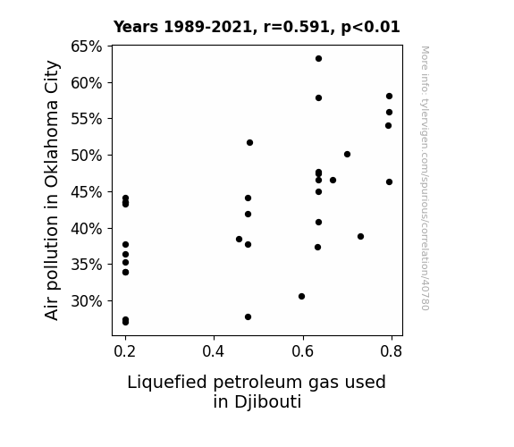 This means 34.9% of the change in the one variable (i.e., Liquefied petroleum gas used in Djibouti) is predictable based on the change in the other (i.e., Air pollution in Oklahoma City) over the 33 years from 1989 through 2021.