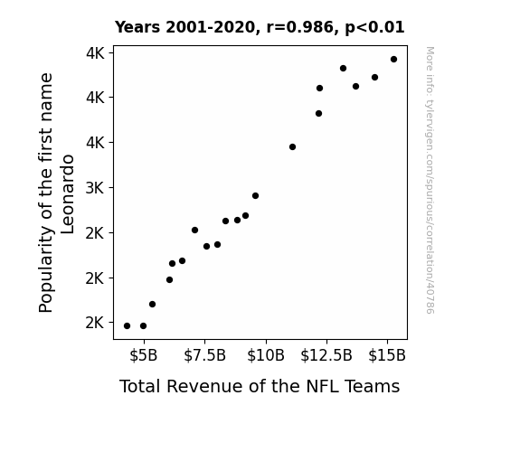 This means 97.2% of the change in the one variable (i.e., Total Revenue of the NFL Teams) is predictable based on the change in the other (i.e., Popularity of the first name Leonardo) over the 20 years from 2001 through 2020.
