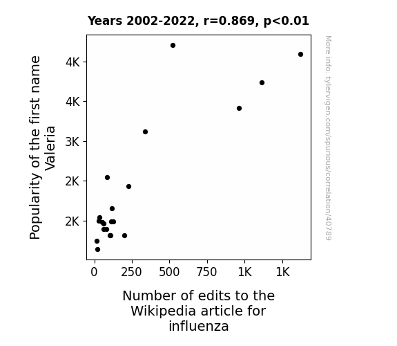 This means 75.5% of the change in the one variable (i.e., Number of edits to the Wikipedia article for influenza) is predictable based on the change in the other (i.e., Popularity of the first name Valeria) over the 21 years from 2002 through 2022.