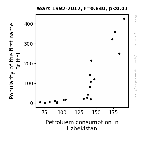 This means 70.6% of the change in the one variable (i.e., Petroluem consumption in Uzbekistan) is predictable based on the change in the other (i.e., Popularity of the first name Brittni) over the 21 years from 1992 through 2012.
