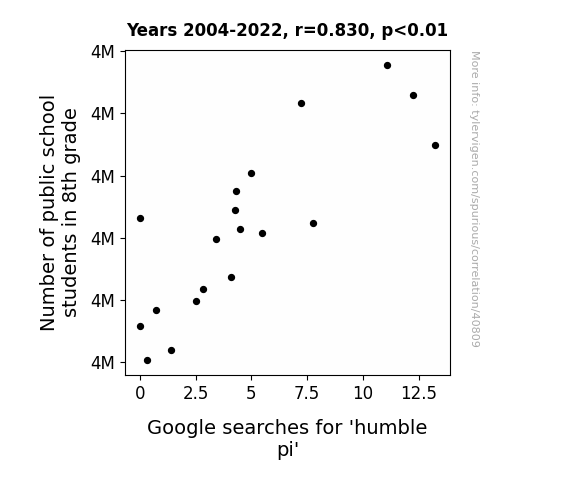 This means 68.9% of the change in the one variable (i.e., Google searches for 'humble pi') is predictable based on the change in the other (i.e., Number of public school students in 8th grade) over the 19 years from 2004 through 2022.
