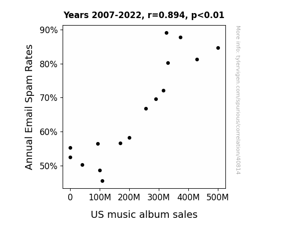 This means 79.9% of the change in the one variable (i.e., US music album sales) is predictable based on the change in the other (i.e., Annual Email Spam Rates) over the 16 years from 2007 through 2022.