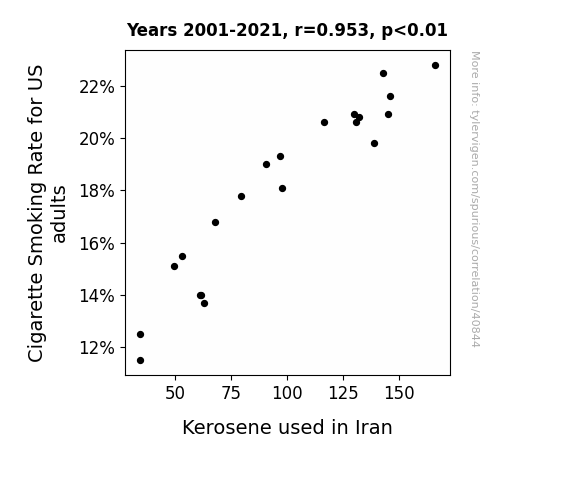 This means 90.9% of the change in the one variable (i.e., Kerosene used in Iran) is predictable based on the change in the other (i.e., Cigarette Smoking Rate for US adults) over the 21 years from 2001 through 2021.