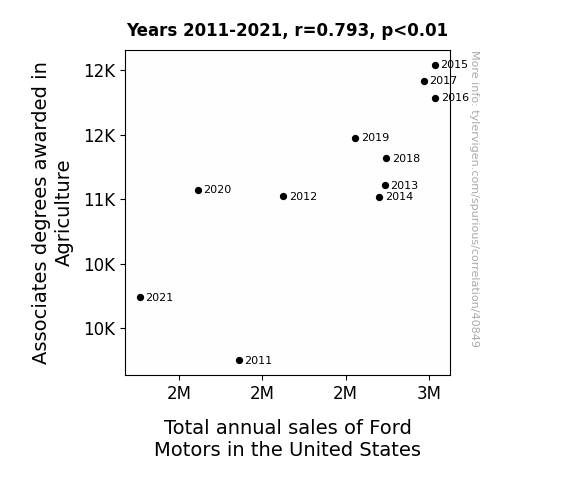 This means 62.9% of the change in the one variable (i.e., Total annual sales of Ford Motors in the United States) is predictable based on the change in the other (i.e., Associates degrees awarded in Agriculture) over the 11 years from 2011 through 2021.