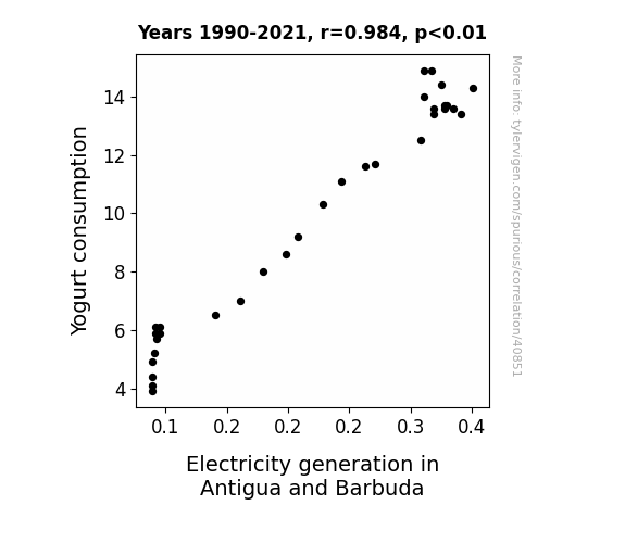 This means 96.9% of the change in the one variable (i.e., Electricity generation in Antigua and Barbuda) is predictable based on the change in the other (i.e., Yogurt consumption) over the 32 years from 1990 through 2021.