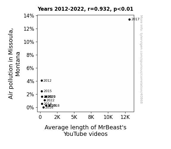 This means 86.9% of the change in the one variable (i.e., Average length of MrBeast's YouTube videos) is predictable based on the change in the other (i.e., Air pollution in Missoula, Montana) over the 11 years from 2012 through 2022.