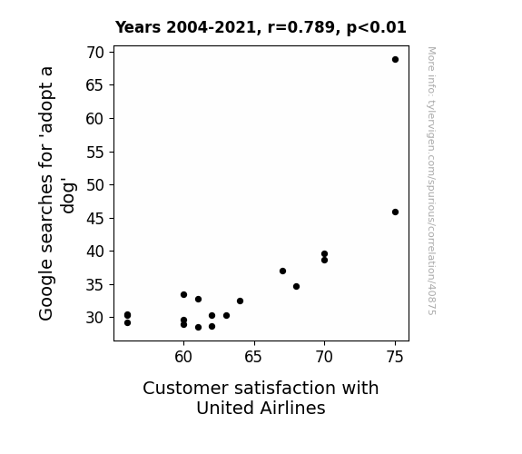 This means 62.3% of the change in the one variable (i.e., Customer satisfaction with United Airlines) is predictable based on the change in the other (i.e., Google searches for 'adopt a dog') over the 18 years from 2004 through 2021.